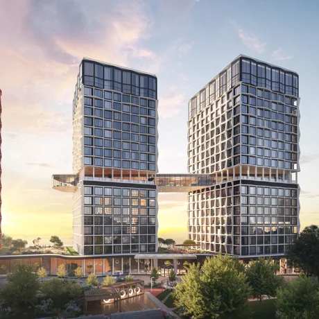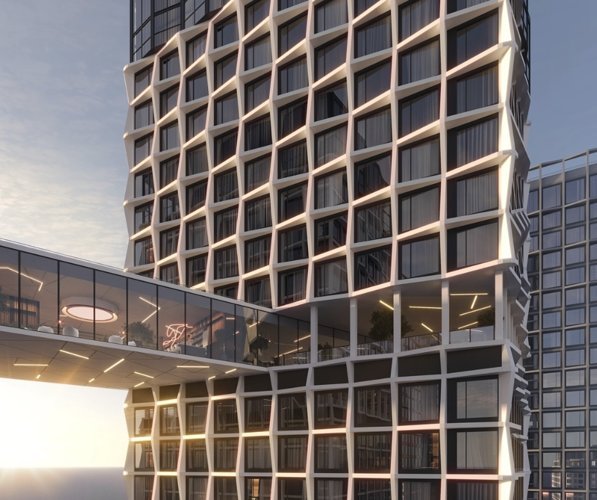 Проект включает пять высотных корпусов, каждый из которых выполнен в современном архитектурном стиле с акцентом на вертикальность и ритм. Фасады оформлены с использованием стекла, металла и световых решений, создающих узнаваемый и футуристичный силуэт.