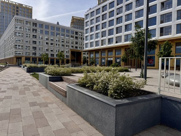 Пространство организовано по принципу «двор без машин», благодаря чему здесь всегда безопасно для детей. Ландшафтный дизайн, освещённые прогулочные аллеи, игровые и спортивные площадки, зоны отдыха с лавочками и озеленением создают ощущение приватности и защищённости от городского шума.