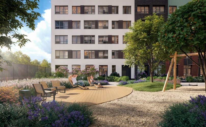 Дворы — отдельная история. Машин там нет, они только внизу. Вместо них — игровые площадки, спортзоны, зелёные уголки, лавочки, качели и даже места, где можно спокойно почитать или просто отдохнуть. Для собак — своя зона для выгула. Вечером красиво подсвечивается, так что атмосфера очень приятная.