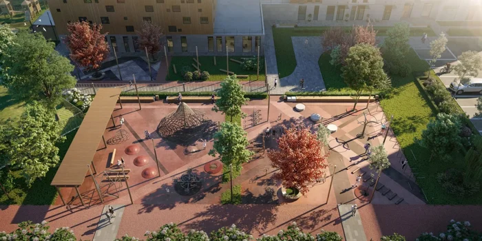 На внутренней территории находится современная детская площадка: песочница, меловая доска для будущих художников, «паутинка», которую так любят дети, стол для настольного тенниса и спортивная площадка. Внутренний двор просторный, озеленённый, с продуманным ландшафтным дизайном. На территории ЖК расположен собственный детский сад, огороженный от остального пространства — за безопасность детей можно не переживать.
