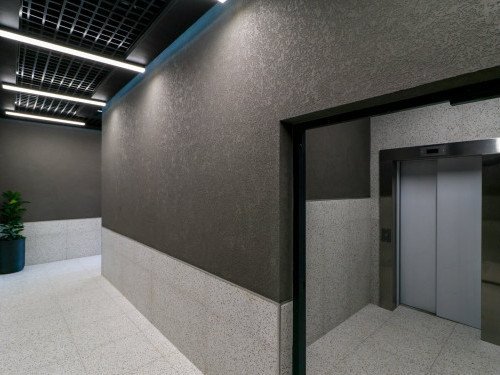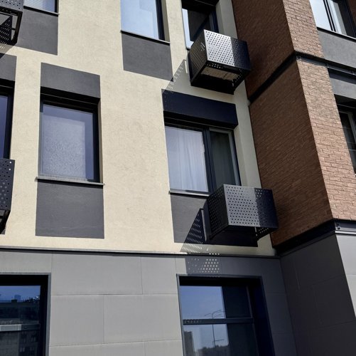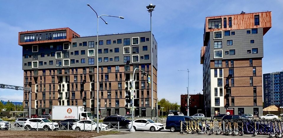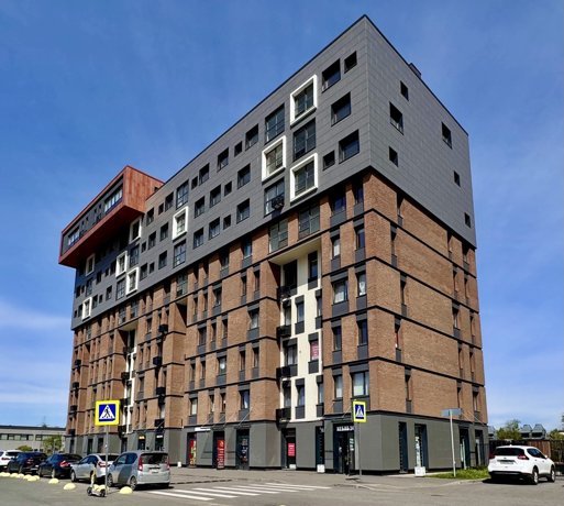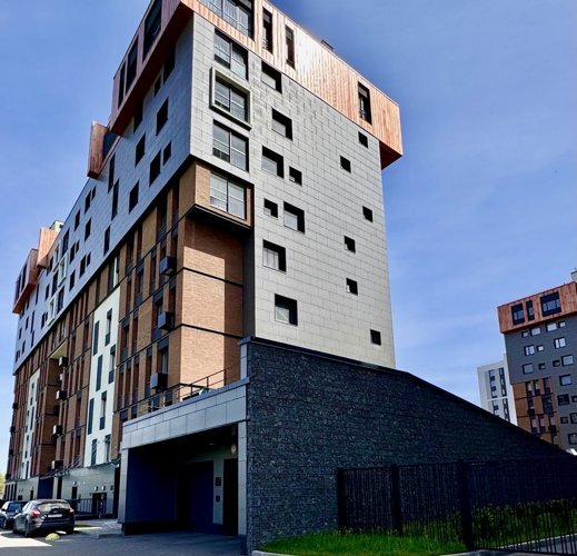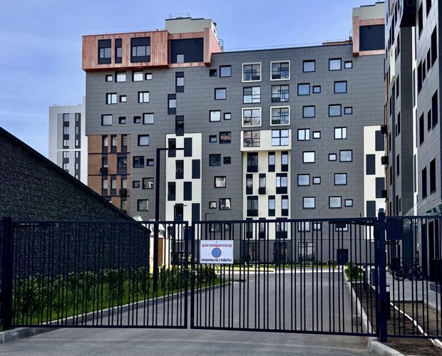В комплексе — три жилых корпуса, здание насчитывает 10 этажей. Входные группы оформлены в серых тонах, в каждом подъезде есть колясочная и зона отдыха. На одном этаже расположено от 3 до 7 квартир.