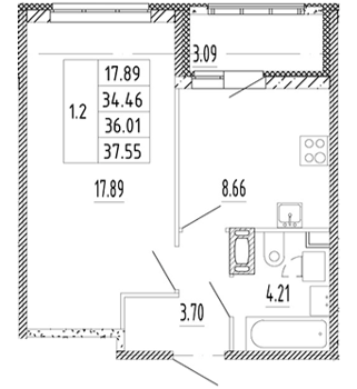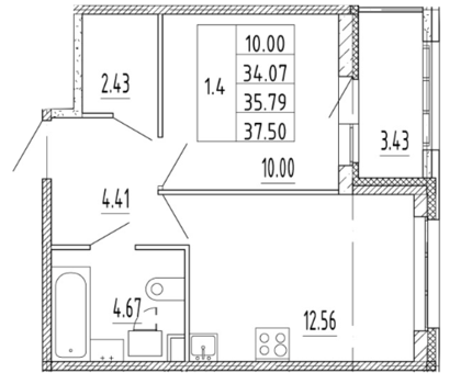 Площадь от 34.53 м2
