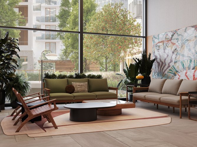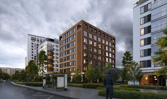 Фасады выполнены в натуральной цветовой палитре с использованием стекла, дерева и камня. Пространства лобби оформлены в сдержанном скандинавском стиле, наполнены светом и живыми деталями.