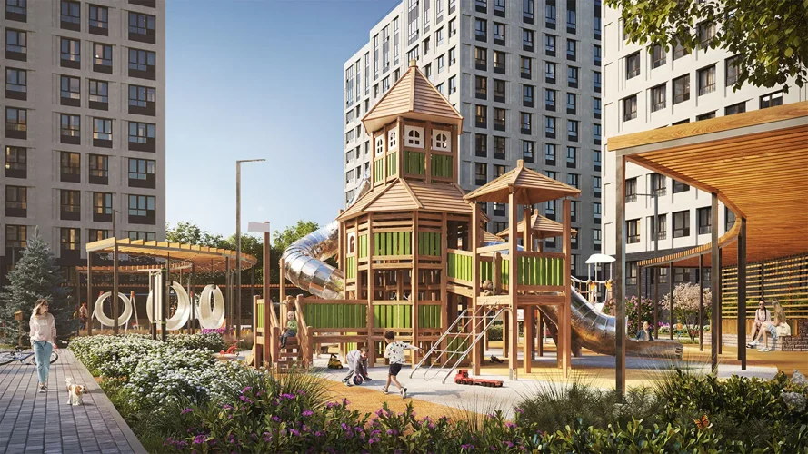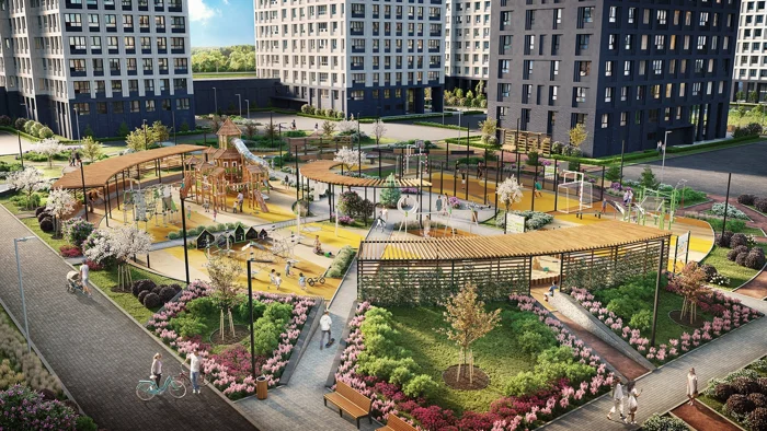 Для малышей — игровые площадки, для взрослых — зоны воркаута и отдыха, скамейки, прогулочные дорожки, озеленение, декоративная подсветка.